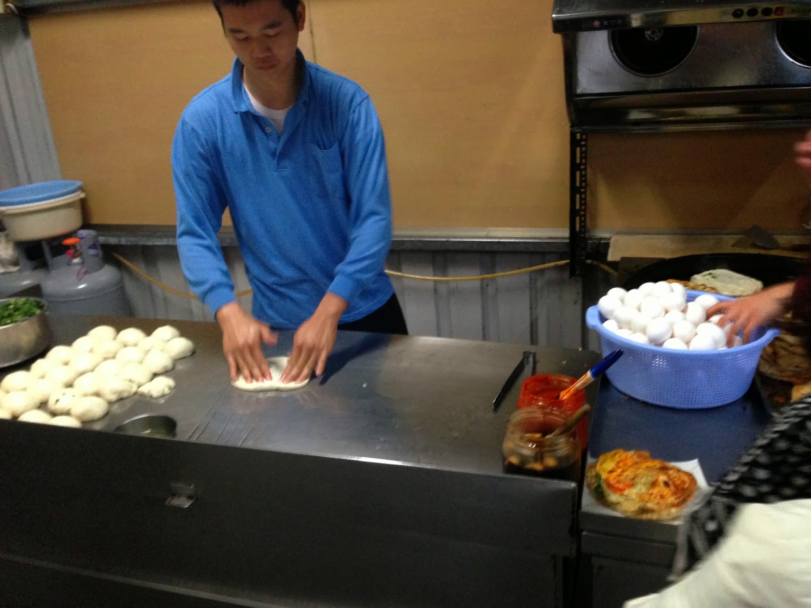 沒錯,重點來了,請看個仔細,左邊這個桶子中的蔥末加上鍋子中間正在爆香的九層塔就是美味的關鍵,你有看過蔥油餅的蔥不但加在餅皮中,還在額外加那麼一大坨的嘛!!!!是想逼死誰啊!還有那間的酥香的蛋蛋!my god!!!!最後在加了爆香的九層塔.......這種味覺的衝擊,誰有自信能夠泰山崩於前還不動聲色的呢???